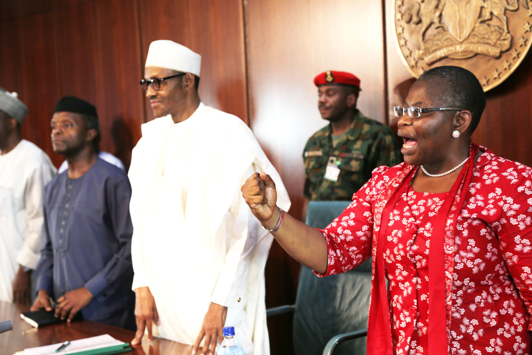 The co-convener, Bring Back Our Girls and Former Education Minister Oby Ezekwesili, President Muhammadu Buhari, Vice President Yemi Osibajo at the Presidential Villa On Wednesday 8th July 2015 PHOTO:Philip Ojisua
