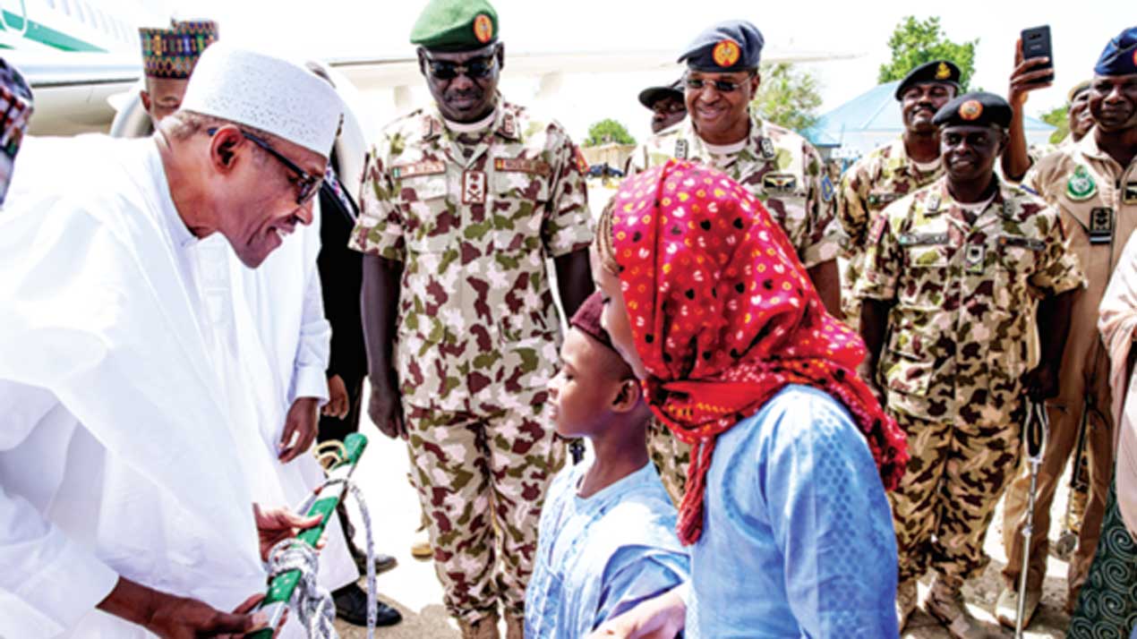 Borno children welcoming President Muhammadu Buhari with a souvenir, alongside Chief of Army Staff Gen. Tukur Buratai and other officers, during their visit to the state for the Grand Finale of the 2018 Nigerian Army Day Celebration in Monguno, Borno State...yesterday