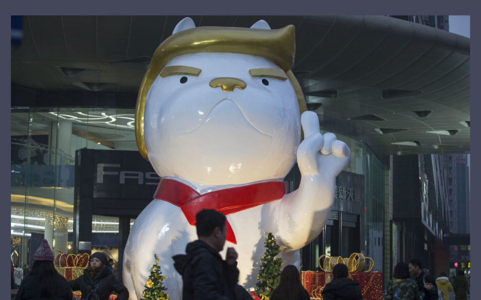 People walk past a statue of a dog, with a resemblance to US President Donald Trump, outside a shopping mall in Taiyuan, in China’s northern Shanxi province on December 29, 2017. A mall in northern China has once again installed a larger than life animal statue with more than a passing resemblance to US President Donald Trump. This time, in anticipation of the coming Year of the Dog, the cocky rooster of last winter has been replaced with a smirking canine. / AFP PHOTO / STR / CHINA OUT