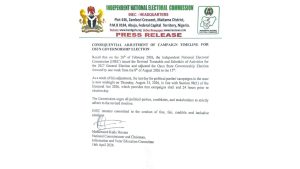 As a result of this adjustment, the last day for political parties’ campaigns in the state is now midnight on Thursday, August 13, 2026, in line with Section 98(1) of the Electoral Act 2026, which provides that campaigns shall end 24 hours prior to election day.