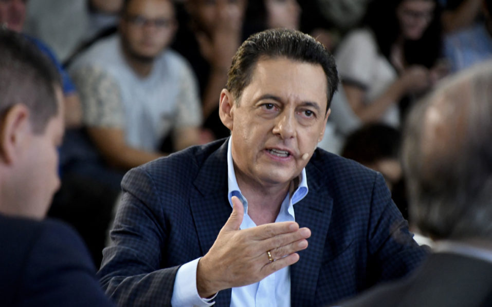 Presidential candidateAntonio Alvarez Desanti of the National Liberation Party speaks during the debate in the prison of La Reforma, in Alajuela, Costa Rica, November 2, 2017. La Reforma prison is the largest prison in Costa Rica. During the debate the prisoners were the ones who asked the questions in the debate. / AFP PHOTO / Ezequiel BECERRA
