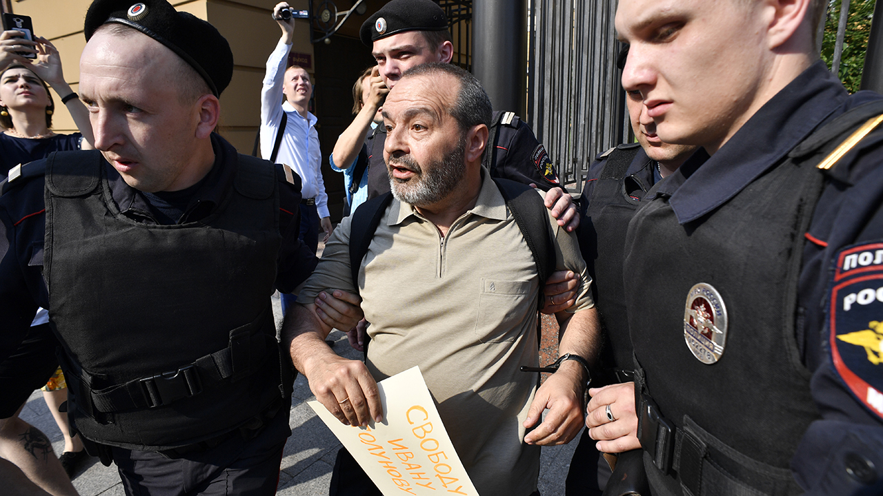 Police officers detain Russian journalist and writer Victor Shenderovich during a rally in support of arrested journalist Ivan Golunov outside the headquarters of the Moscow branch of the Russian Interior Ministry in Moscow on June 7, 2019. – A investigative reporter with Meduza, an independent Russian-language media outlet, has been detained in Moscow over alleged drug dealing in what the publication said on June 7, 2019 was punishment for his work. (Photo by Alexander NEMENOV / AFP)