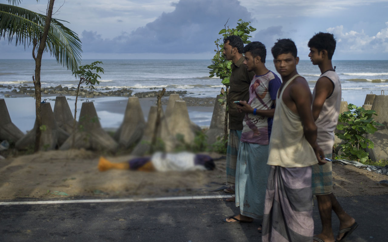 People stand next to the covered body of Rohingya Muslim refugee near Inani beach, Cox’s Bazar on September 29, 2017. At least 15 people drowned and scores are feared missing after a boat carrying Rohingya families capsized off Bangladesh on September 28, as UN chief Antonio Guterres exhorted Myanmar’s leaders to end the refugees’ “nightmare.” More than half a million Rohingya Muslims have fled to Bangladesh in the last month, after the military in Buddhist-majority Myanmar launched vicious operations against Rohingya rebels. / AFP PHOTO / FRED DUFOUR