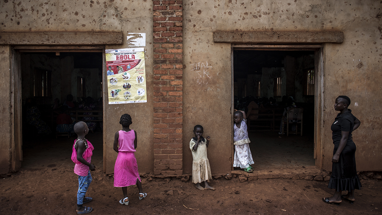 In the village of Mangina, where dozens have died of Ebola at the epicentre of Democratic Republic of Congo’s latest outbreak, children are to be seen everywhere — except in school, because their parents fear they will be infected in class. “The children are not here today. It’s the parents who are keeping them at home,” primary school teacher Christian Muhindo said as he paced between empty desks. “They think that the children will be easily contaminated at school.” / AFP PHOTO / John WESSELS