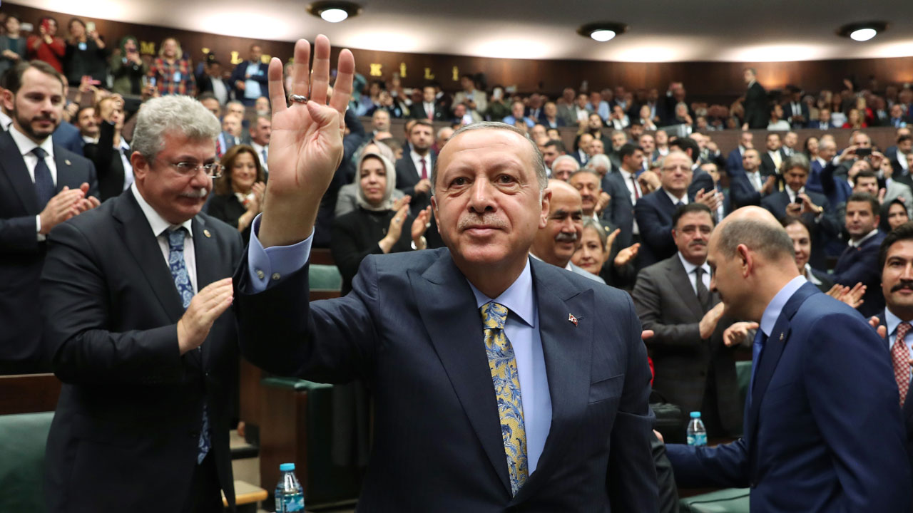 This handout photo released by Turkish President Office shows Turkish President and leader of Turkey's ruling Justice and Development (AK) Party Recep Tayyip Erdogan (C) is applauded after delivering his speech during his party's parliamentary group meeting at the Grand National Assembly of Turkey in Ankara, on October 23, 2018. - Turkish President Recep Tayyip Erdogan called for 18 Saudi suspects in the murder of journalist Jamal Khashoggi to stand trial in Istanbul, saying all those involved had to face punishment. (Photo by KAYHAN OZER and HO / TURKISH PRESIDENT OFFICE / AFP) / RESTRICTED TO EDITORIAL USE - MANDATORY CREDIT "AFP PHOTO / TURKISH PRESIDENT OFFICE / KAYHAN OZER" - NO MARKETING NO ADVERTISING CAMPAIGNS - DISTRIBUTED AS A SERVICE TO CLIENTS