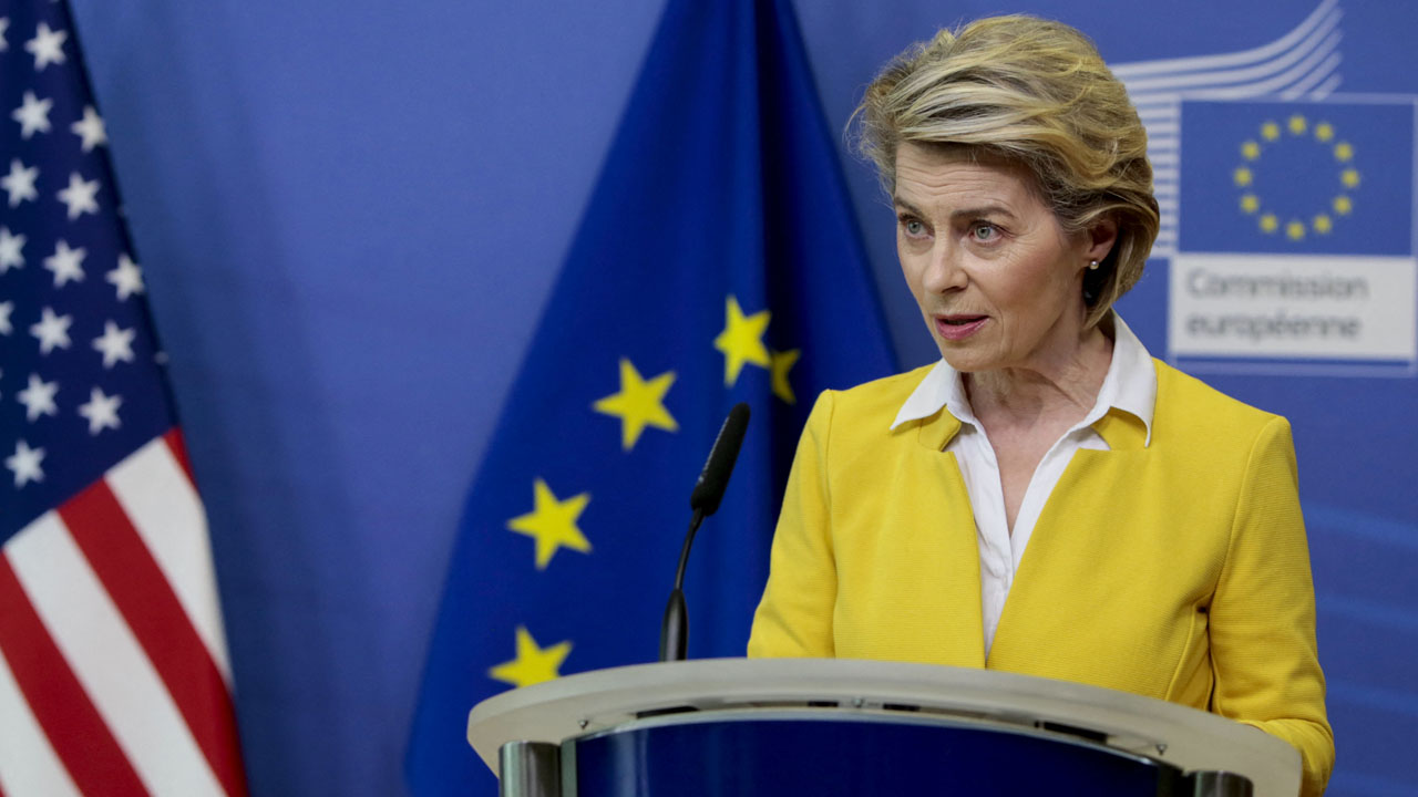 President of the European Commission Ursula von der Leyen gives a press conference with the US Secretary of State ahead of their meeting in Brussels, on March 24, 2021. (Photo by Virginia Mayo / POOL / AFP)