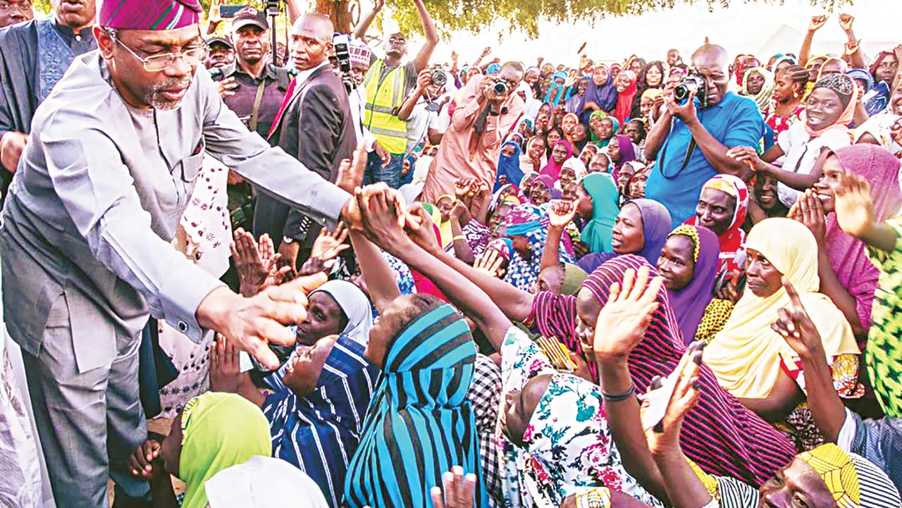 Speaker, House of Representatives, Femi Gbajabiamila (left) during his visit to internally displaced persons (IDP) camp in Borno State …yesterday. PHOTO: NAN