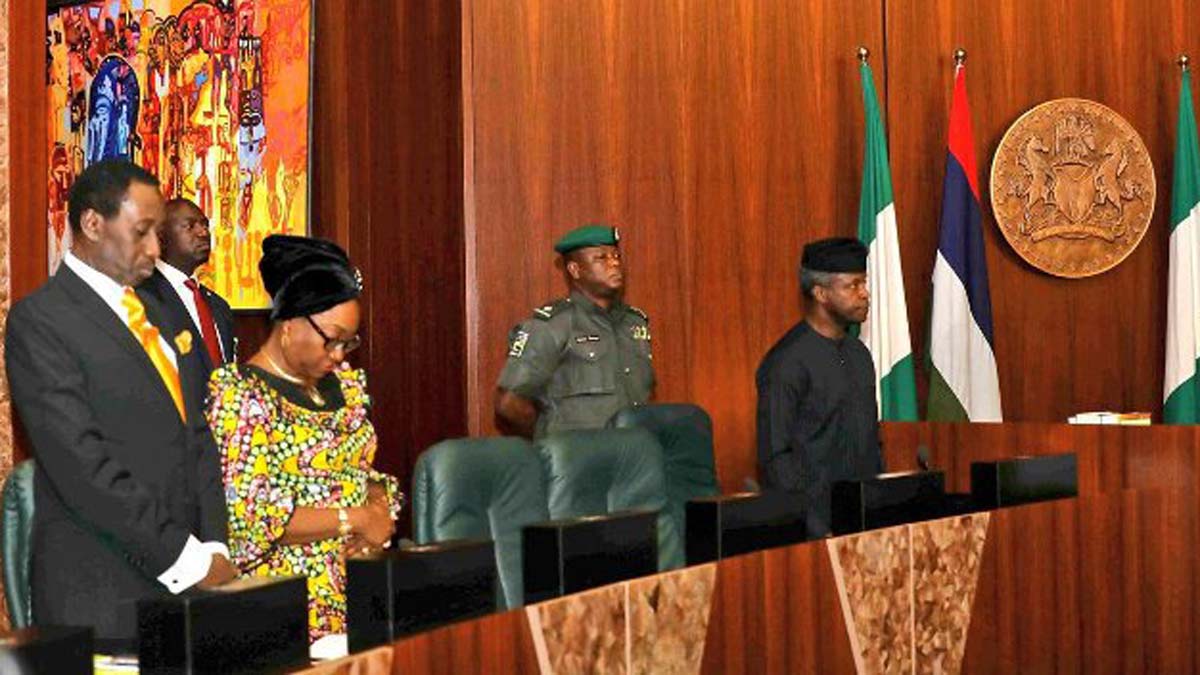 Vice President Yemi Osinbajo rear the empty seat of the president during the Federal Executive Council meeting presided over the by vice president in Abuja…
