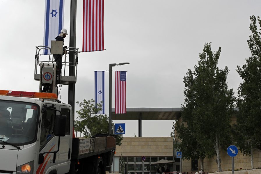 Municipal workers erected signposts reading “US Embassy” in Hebrew, Arabic and English around the site, currently a US consular building, in the city’s Arnona neighbourhood.
