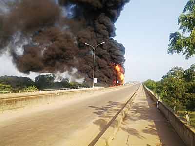 NOT less than four persons were burnt beyond recognition yesterday when a fuel-laden tanker burst into flames on the River Niger Bridge after Itobe in Ajakuta Local Council of Kogi State.