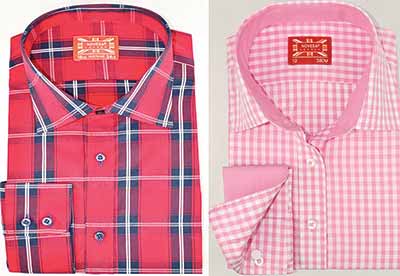 • Next is, men’s black, red and white large check shirt, single cuff orange label shirt. There is also women’s medium pink check shirt with inside collar, placket and outside cuff pink contrast in double cuff.