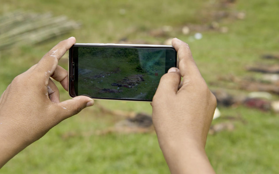 A man takes photos with a mobile phone of the dead bodies in Yebawkya village, Maungdaw on September 27, 2017. Myanmar’s army said on September 24, 2017 it had discovered a mass grave containing the bodies of 28 Hindus, including women and children, in violence-wracked Rakhine state, blaming the killings on Muslim Rohingya militant. / AFP PHOTO / STR