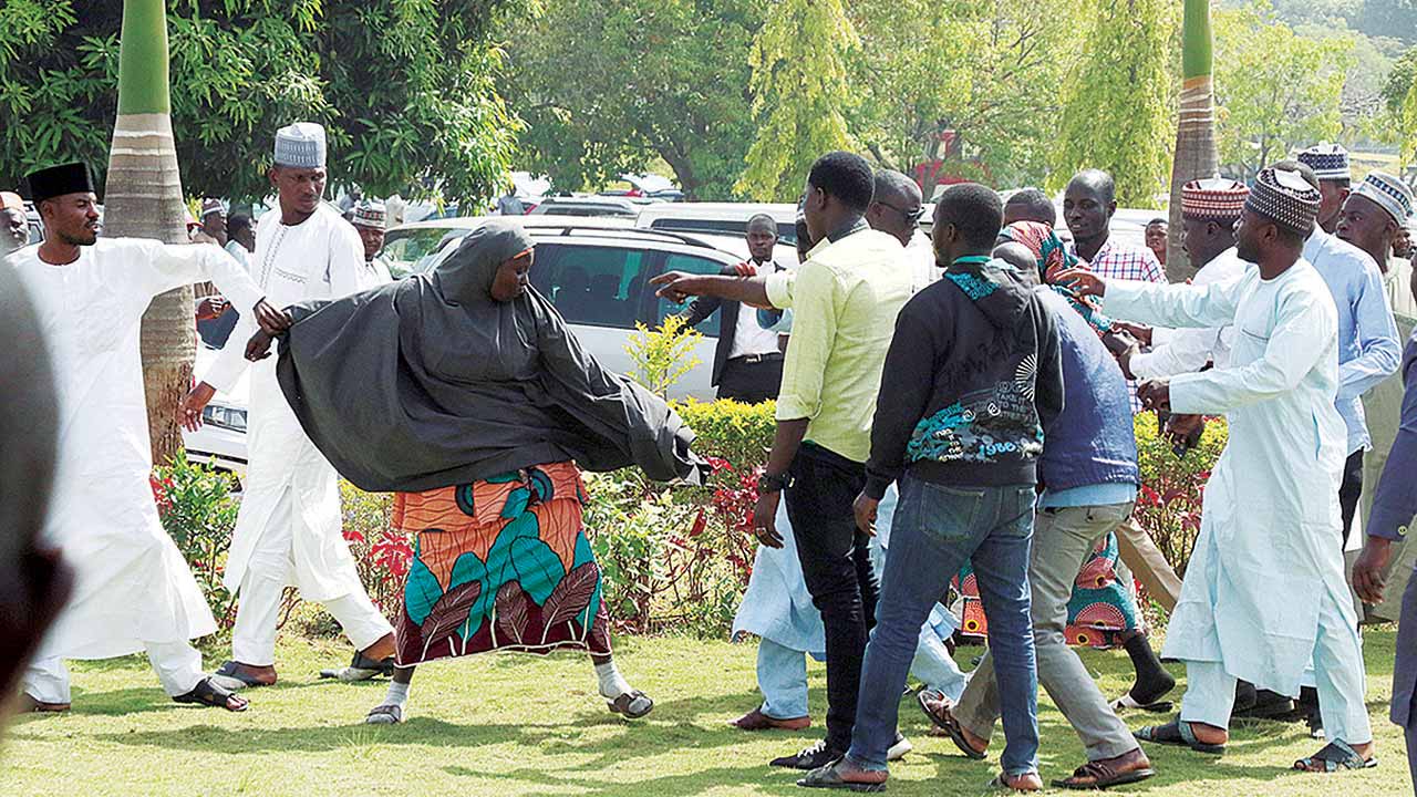 Party supporters in a free-for-all fight before the Supreme Court suspended proceeding for the seven governorship election cases till today in Abuja …yesterday. PHOTO: PHILIP OJISUA