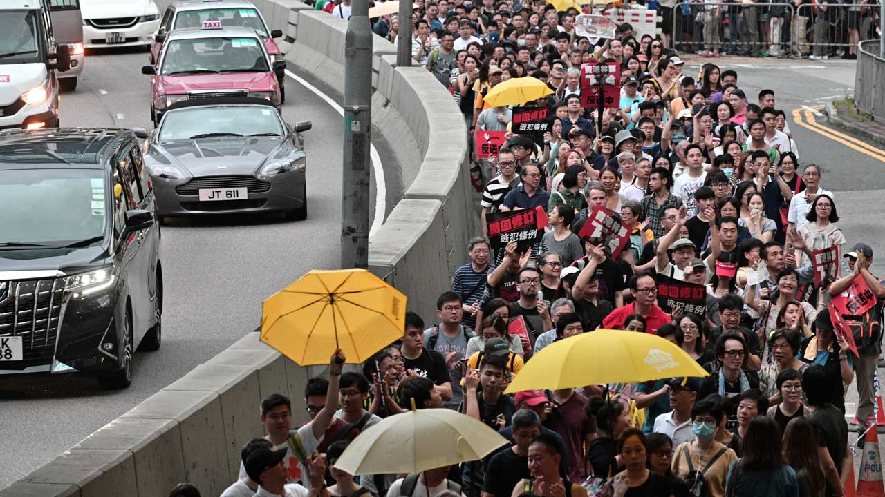Demonstrators on Sunday chanted “Step down, Carrie Lam!” — referring to the city’s pro-Beijing leader, while many held the yellow umbrellas that symbolised the 2014 rallies.