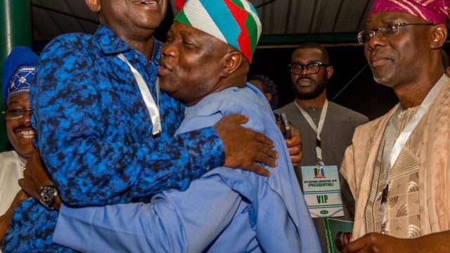 Lagos State governor Akinwunmi Ambode might have described Babajide Sanwo-Olu to whom he lost the Lagos State governorship primaries has an unfit for the office of the governor last week. But when the two men met their political benefactor Bola Tinubu at the national convention of the APC Saturday night, it was all hugs and smiles