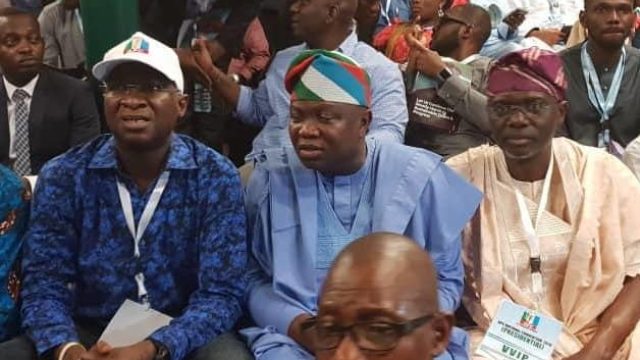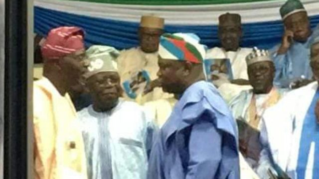 Jide Sanwo-Olu, Bola Tinubu and Governor of Lagos state, Akinwunmi Ambode at the APC convention in Abuja. Photo: Twitter/@thecable
