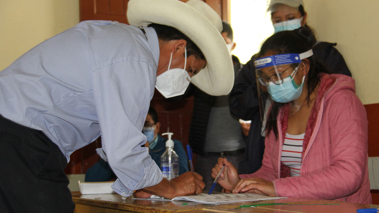 In this picture released by Peruvian news agency Andina, Peruvian presidential candidate for the Peru Libre (Free Peru) Party, Pedro Castillo, signs a voters log after casting his vote at a polling station in Cajamarca, Peru, during general elections on April 11, 2021. - An early exit poll by the IPSOS firm, released soon after voting stations closed, gave the radical left unionist Pedro Castillo the first place, with 16.1%. Some 25 million Peruvians voted today for a new president and 130 members of the unicameral congress amid the country’s deadliest week of the coronavirus pandemic and a surge in new infections. A runoff second vote is scheduled on June 6. (Photo by - / ANDINA / AFP) / RESTRICTED TO EDITORIAL USE - MANDATORY CREDIT "AFP PHOTO / ANDINA " - NO MARKETING - NO ADVERTISING CAMPAIGNS - DISTRIBUTED AS A SERVICE TO CLIENTS