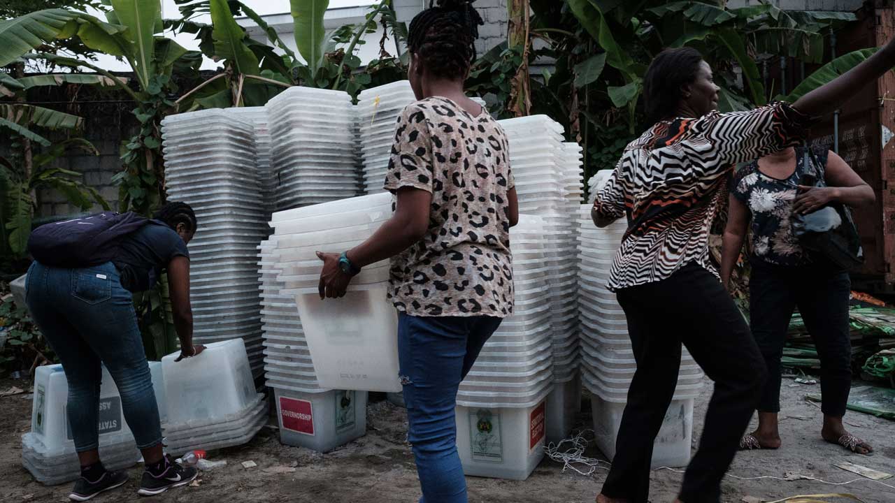 Staff members of the Independent National Electoral Commission (INEC) return ballot boxes after outside their local office in Port Harcourt, Southern Nigeria on February 16, 2019 after Nigeria’s electoral watchdog postponed presidential and parliamentary elections for one week, just hours before polls were due to open. The two main political parties swiftly condemned the move and accused each other of orchestrating the delay as a way of manipulating the vote. Yasuyoshi CHIBA / AFP