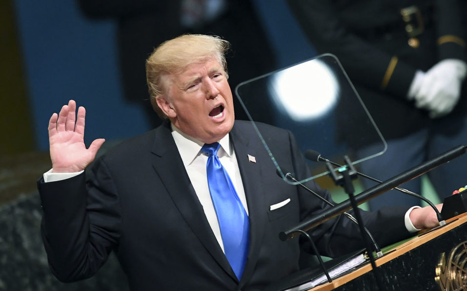 US President Donald Trump addresses the 72nd Annual UN General Assembly in New York on September 19, 2017. / AFP PHOTO / Jewel SAMAD