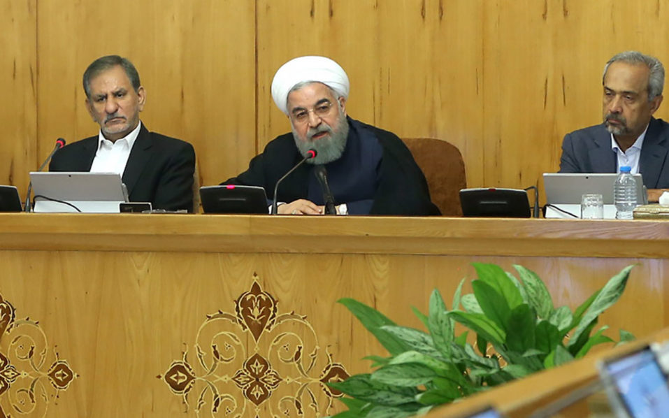 A handout picture provided by the office of Iranian President Hassan Rouhani on July 19, 2017 shows him (2nd R) sitting next to Vice President Eshaq Jahangiri (2nd L) during a cabinet meeting in Tehran. / AFP PHOTO / IRANIAN PRESIDENCY / Handout / == RESTRICTED TO EDITORIAL USE - MANDATORY CREDIT "AFP PHOTO / HO / IRANIAN PRESIDENCY" - NO MARKETING NO ADVERTISING CAMPAIGNS - DISTRIBUTED AS A SERVICE TO CLIENTS ==