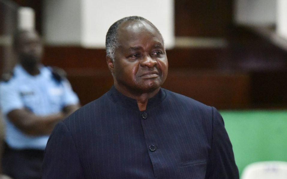 Former Ivorian minister for labour and public service, Hubert Oulaye, accused of complicity in the assassination of UN soldiers, hears the verdict in his trial in at the Assize Court in Abidjan on December 26, 2017. Oulaye was sentenced on December 26 to 20 years in prison for complicity in the assassination of 18 people including 7 UN soldiers. / AFP PHOTO / Sia KAMBOU