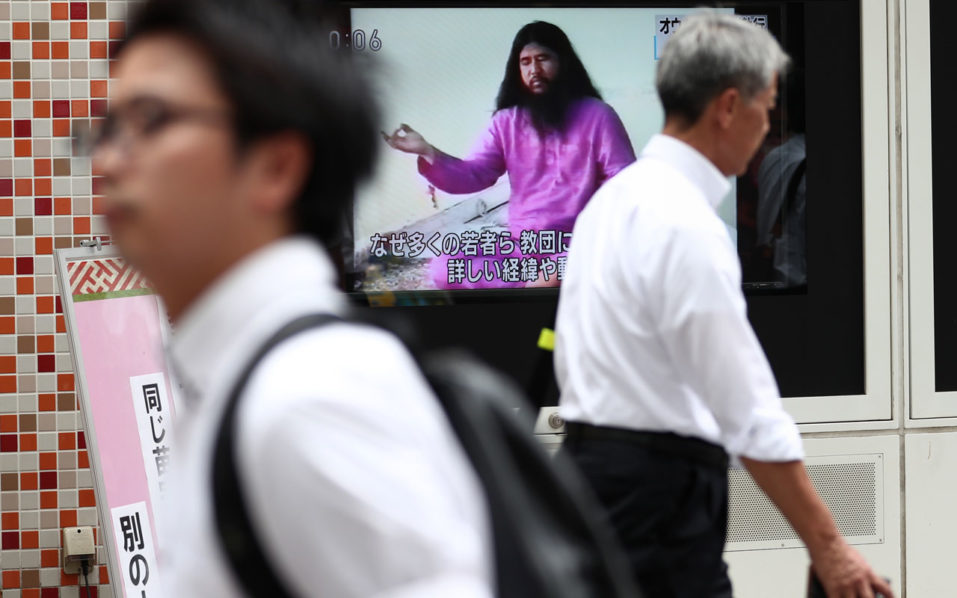 Pedestrians walk past a screen flashing a TV news channel showing Shoko Asahara, leader of the Aum Shinrikyo cult, after the execution of six other members of the Aum Supreme Truth doomsday cult, in Tokyo on July 26, 2018. Japan on July 26 executed six more members of the cult behind the deadly 1995 sarin attack on the Tokyo subway, local media said, weeks after the group's leader was hanged. / AFP PHOTO / Behrouz MEHRI