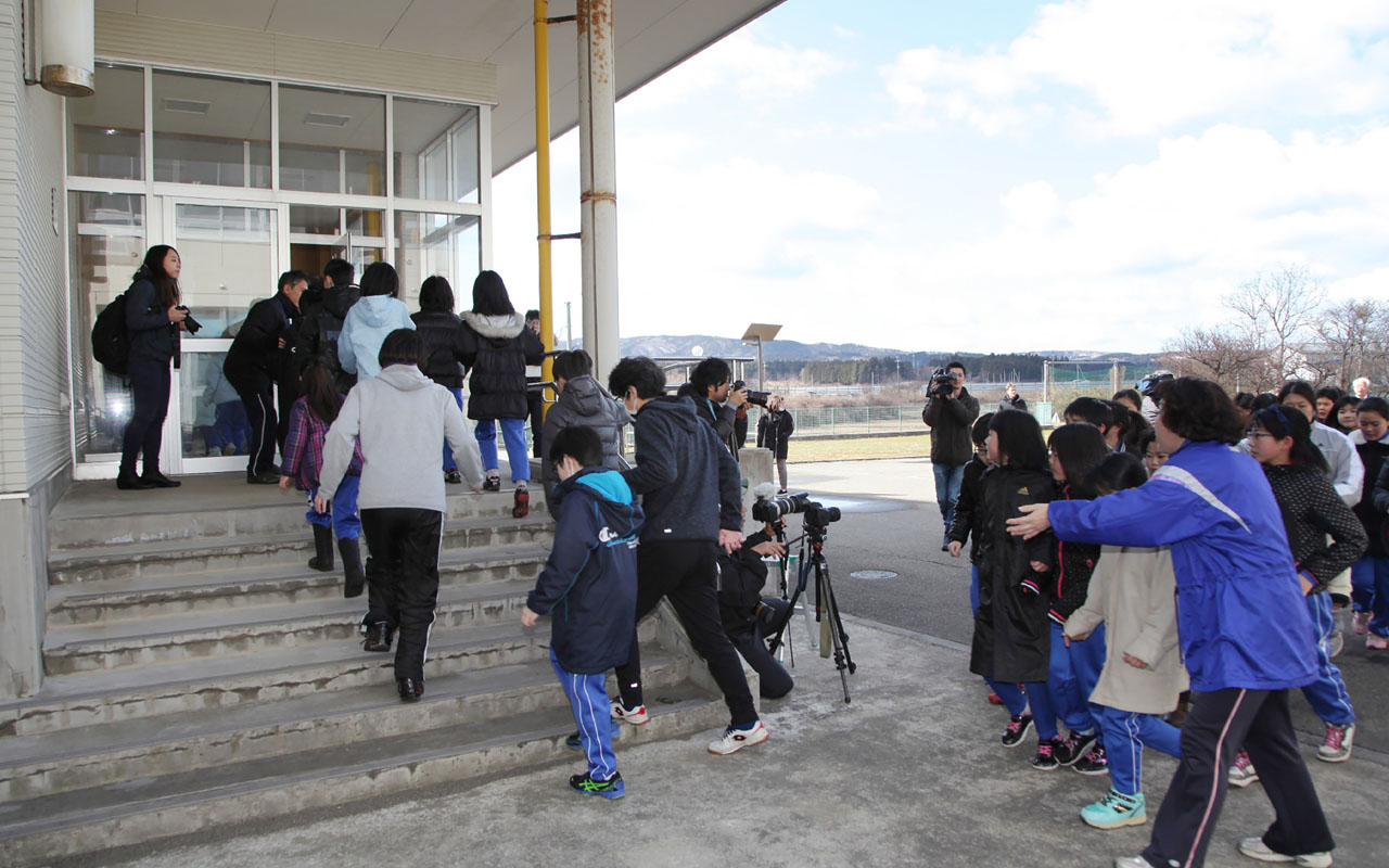 Local residents move towards a school gymnasium during an evacuation drill at Oga city, Akita prefecture on March 17, 2017. Japan held its first drill to evacuate residents in response to a North Korean missile landing in its terrirorial waters on March 6. / AFP PHOTO / JIJI PRESS / STR / Japan OUT