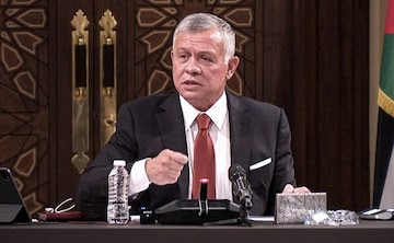 A handout picture released by the Jordanian Royal Palace on March 23, 2021 shows Jordanian King Abdullah II speaking during a meeting with the speaker and heads of a number of committees at the House of Representatives in the capital Amman. (Photo by - / Jordanian Royal Palace / AFP)