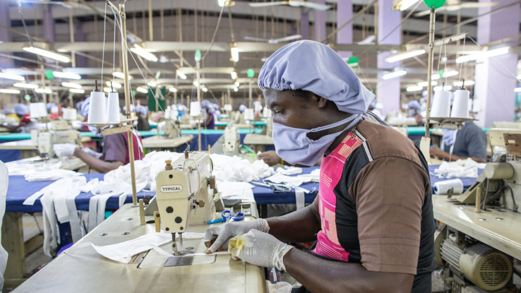 A man uses a sewing machine to assemble a piece of personal protective equipment for COVID-19 coronavirus frontline health workers at a factory commissioned by the government, in Accra, on April 17, 2020. – Most nations across the African continent have stopped short of forcing all of their citizens to stay indoors.