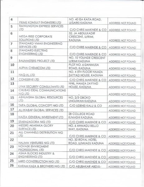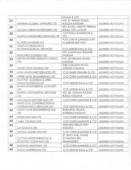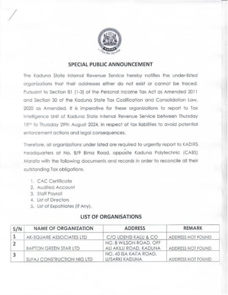 KADIRS said, “The Kaduna State Internal Revenue Service hereby notifies the under-listed organisations that their addresses either do not exist or cannot be traced. Pursuant to Section 81 (1-3) of the Personal Income Tax Act as Amended 2011 and Section 30 of the Kaduna State Tax Codification and Consolidation Law, 2020 as Amended,
