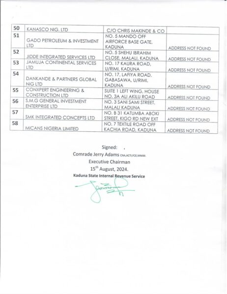 “Therefore, all organisations listed are required to urgently report to KADIRS Headquarters at No. 8/9 Bima Road, opposite Kaduna Polytechnic (CABS) Marafa, with the following documents and records in order to reconcile all their outstanding tax obligations: CAC Certificate, Audited Account, Staff Payroll, List of Directors, List of Expatriates (If Any).”