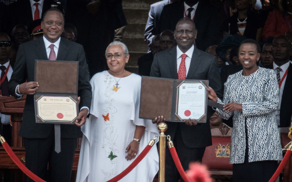 Kenya’s President Uhuru Kenyatta (L) and Vice-President William Ruto (2R) hold certificates during the inauguration ceremony at Kasarani Stadium in Nairobi, on November 28, 2017. President Uhuru Kenyatta vowed to be the leader of all Kenyans and work to unite the country after a bruising and drawn out election process that ended with his swearing-in. / AFP PHOTO / YASUYOSHI CHIBA