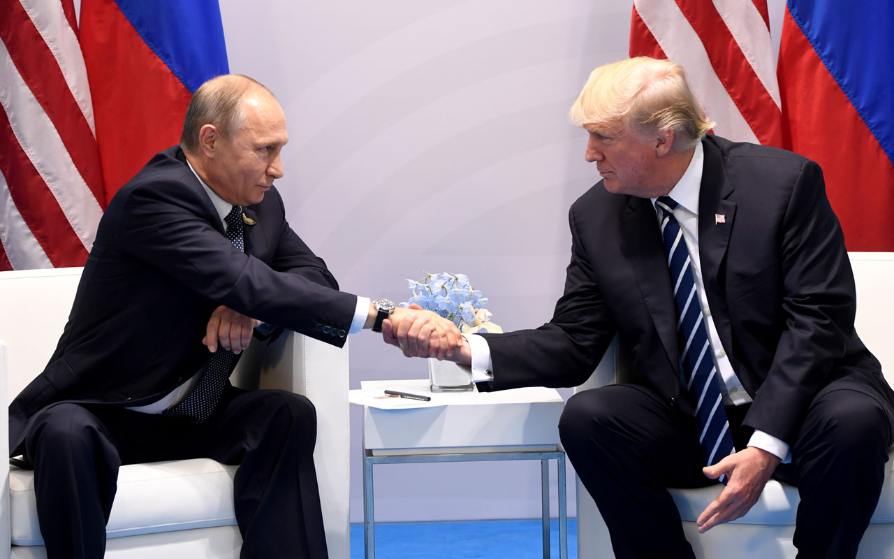 (FILES) In this file photo taken on July 7, 2017, US President Donald Trump and Russia’s President Vladimir Putin shake hands during a meeting on the sidelines of the G20 Summit in Hamburg, Germany.