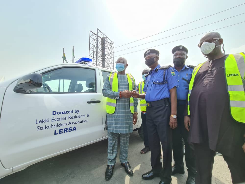 Olorogun James Emadoye, LERSA President; Lekki Area Commander, ACP Gbolahan Olugbemi and Mr John Ifoto, Chairman LERSA Security Committee at the presentation of Patrol Van to the Police at the Ajah Division of of the Nigerian Police on Thursday.