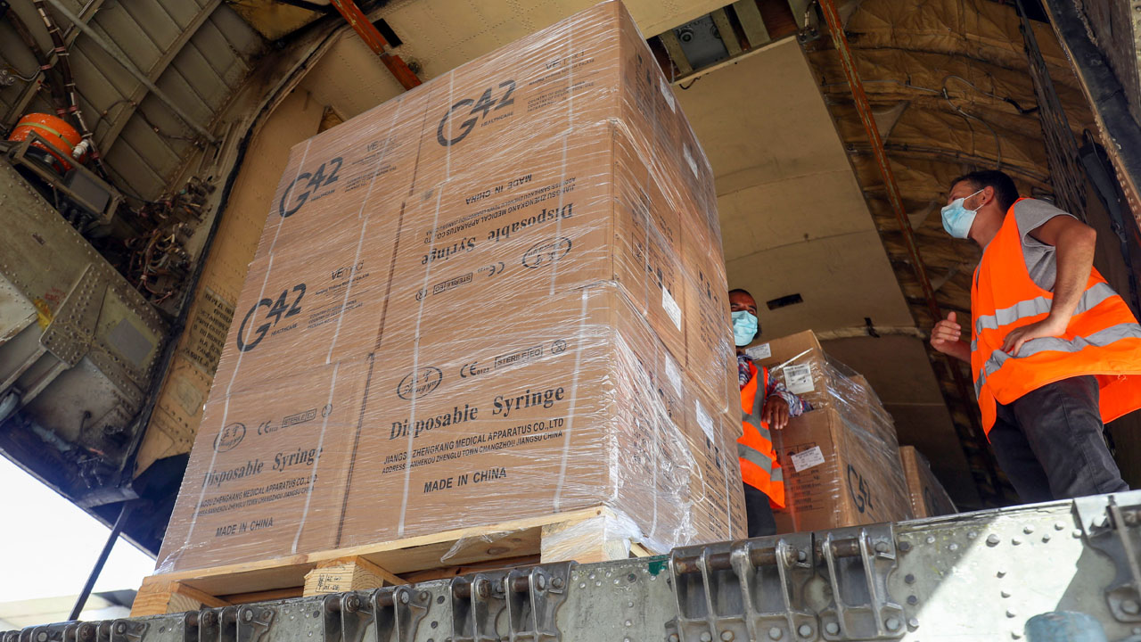Libyan workers prepare to unload a shipment of the Chinese Sinopharm vaccine against COVID-19, at Mitiga International Airport in the capital Tripoli, on August 2, 2021. – On July 11, Libya imposed sweeping restrictions to stem the spread of coronavirus as recorded cases hit a new high. These included a ban on weddings and organised funerals with mourners. (Photo by Mahmud TURKIA / AFP)