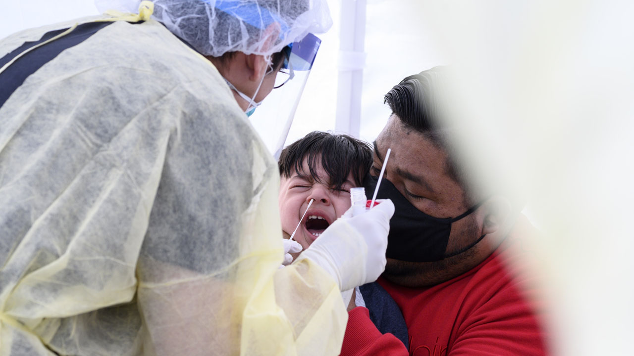 Jose Vatres (R) holds his son Aidin who reacts as nurse practitioner Alexander Panis (L) takes a nasal swab sample to test for COVID-19 at a mobile testing station in a public school parking area in Compton, California, just south of Los Angeles, on April 28, 2020. - St. John's Well Child and Family Center is providing COVID-19 testing sites in African-American and Latino communities which have been neglected in terms of testing as compared to wealthier areas of Los Angeles County. (Photo by Robyn Beck / AFP)