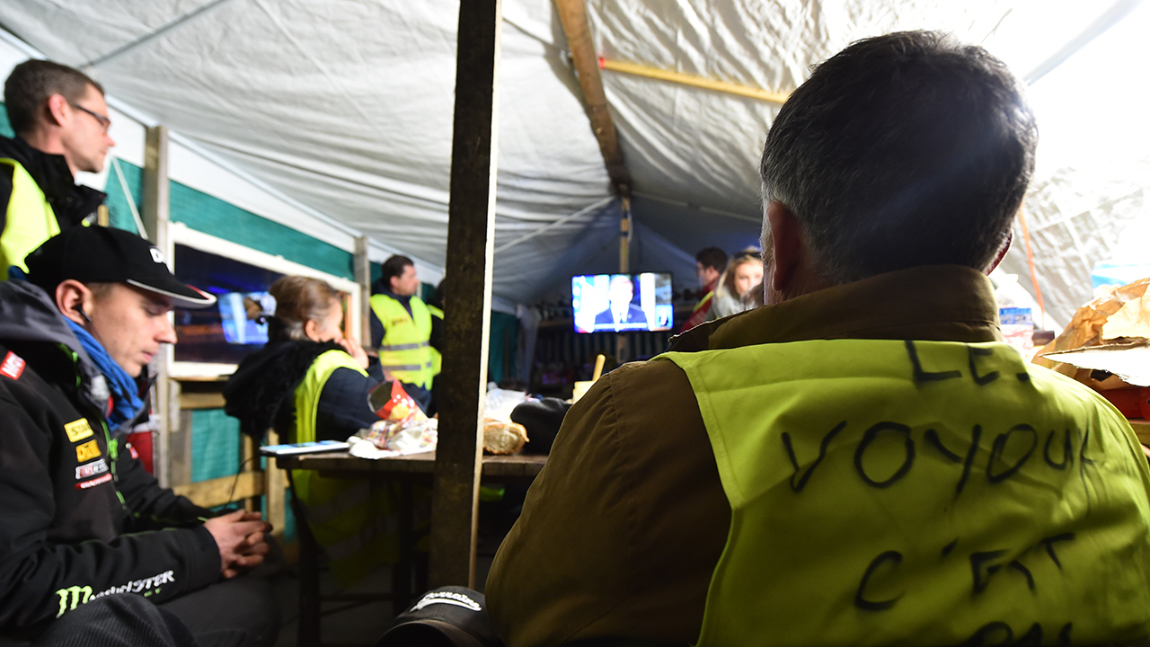 A man wearing a yellow vest (Gilet jaune) with a writing “the rogue is” watches TV under a tent in Montabon, near Le Mans on December 10, 2018 as French president delivers a TV speech following the so-called “yellow jacket crisis”, at the presidential office in the Elysee Palace. (Photo by JEAN-FRANCOIS MONIER / AFP)French President Emmanuel Macron announced on Monday a 100-euro ($113) per month increase in the minimum wage from next year in a major concession to “yellow vest” protesters who have roiled the country.