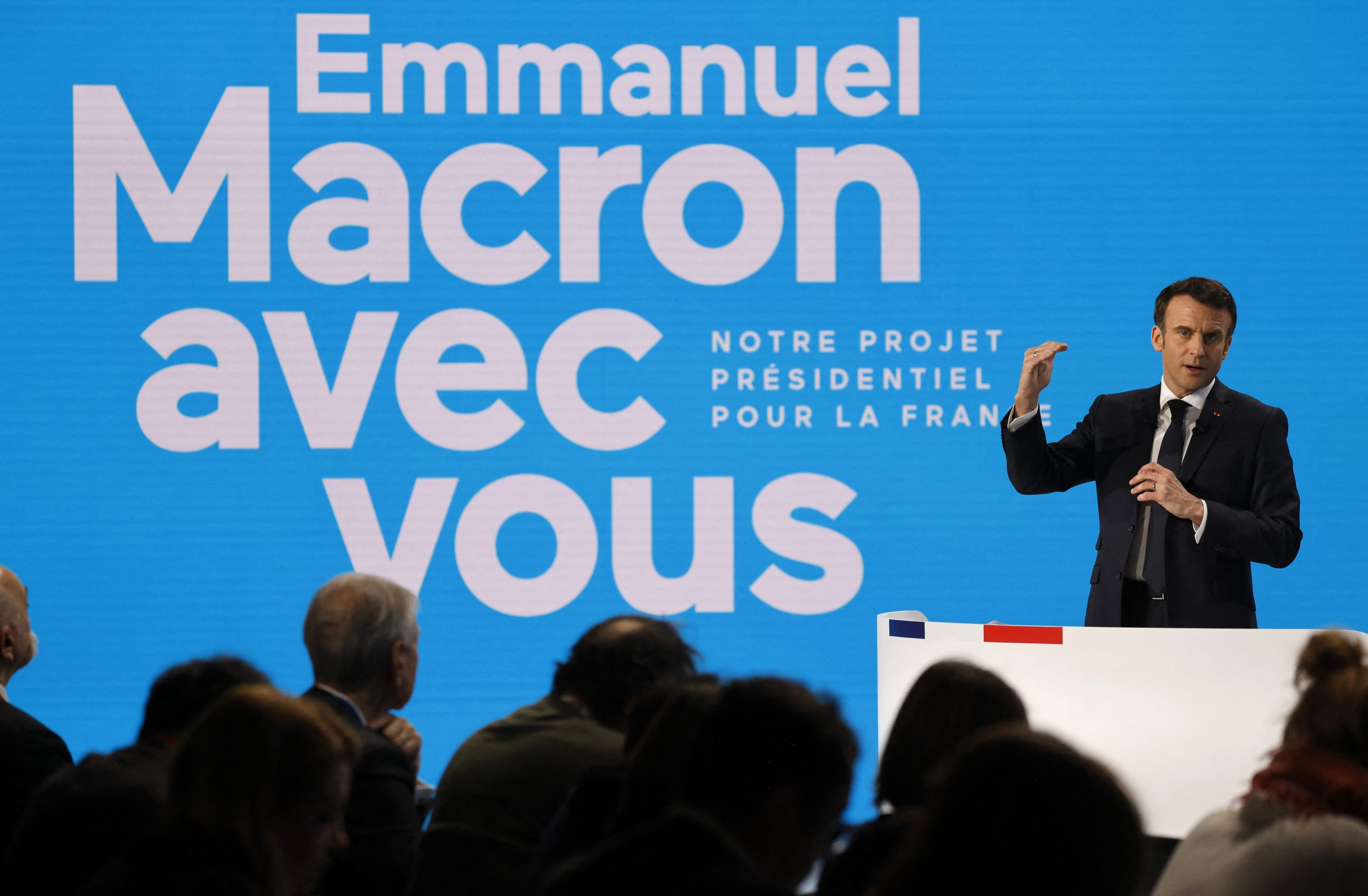 France's President Emmanuel Macron, and French liberal party La Republique en Marche (LREM) candidate to his succession speaks during a press conference to present his political program ahead of the April 10/24 presidential election in France, in the Paris' suburban city of Aubervilliers, on March 17, 2022. (Photo by Ludovic MARIN / AFP)