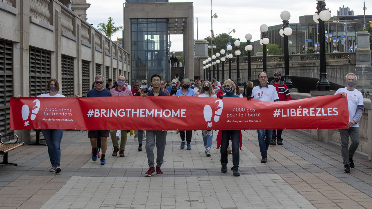 Hundreds of supporters of two Canadian men being held in China on what Ottawa says are specious charges marched 7,000 steps through the Canadian capital on Sunday to mark the pair’s 1,000th day of “unjust” detention.