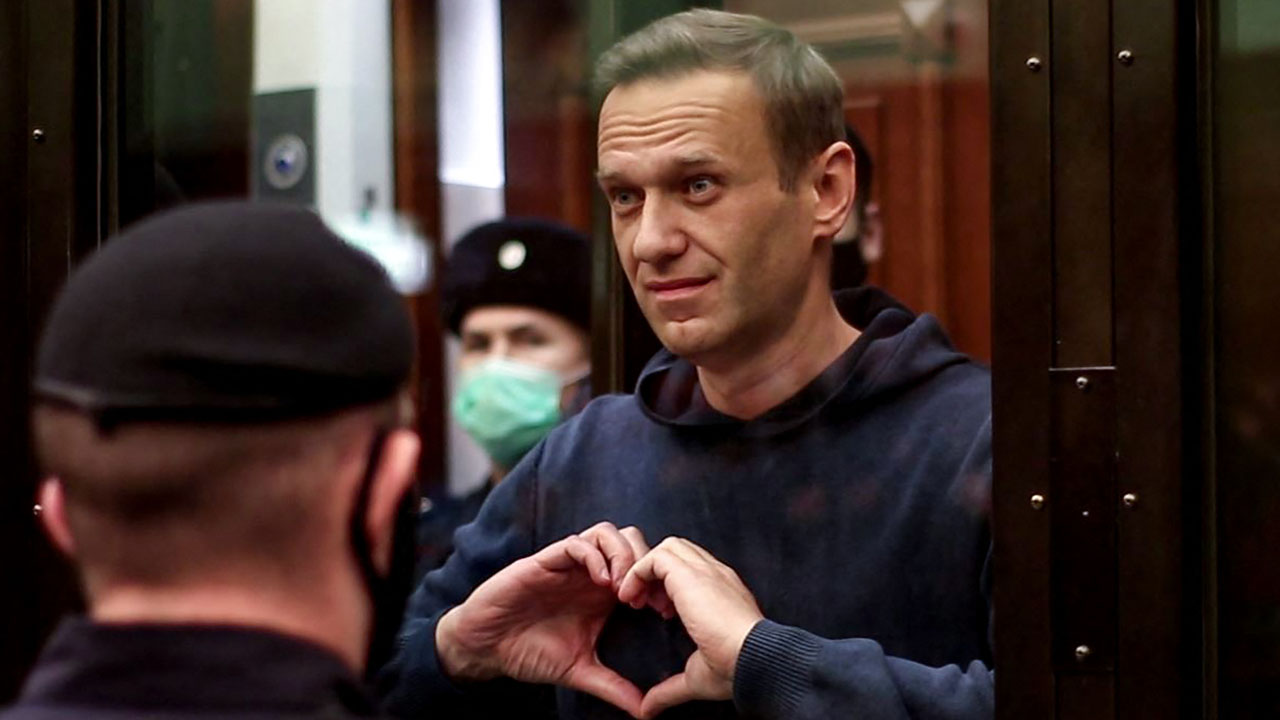 (FILES) In this file photo taken on February 02, 2021 This screen grab from a handout footage provided by the Moscow City Court press service shows Russian opposition leader Alexei Navalny, charged with violating the terms of a 2014 suspended sentence for embezzlement, gesturing a heart shape from inside a glass cell during a court hearing in Moscow. - Jailed Kremlin critic Alexei Navalny is in great pain, his lawyer said on March 25, 2021 after visiting him in prison, adding that allies were afraid "for his life." (Photo by Handout / Moscow City Court press service / AFP) / RESTRICTED TO EDITORIAL USE - MANDATORY CREDIT "AFP PHOTO / Moscow City Court press service / handout" - NO MARKETING - NO ADVERTISING CAMPAIGNS - DISTRIBUTED AS A SERVICE TO CLIENTS