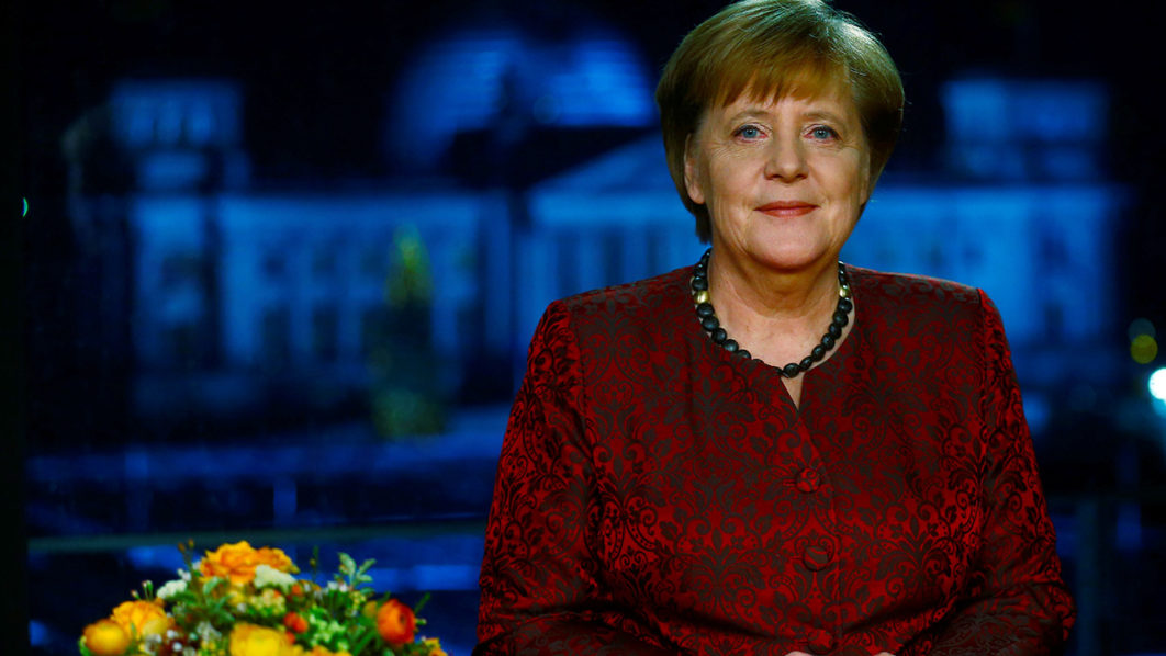 German Chancellor Angela Merkel poses for a photograph after the recording of her annual New Year’s speech at the Chancellery in Berlin on December 30, 2017. / AFP PHOTO
