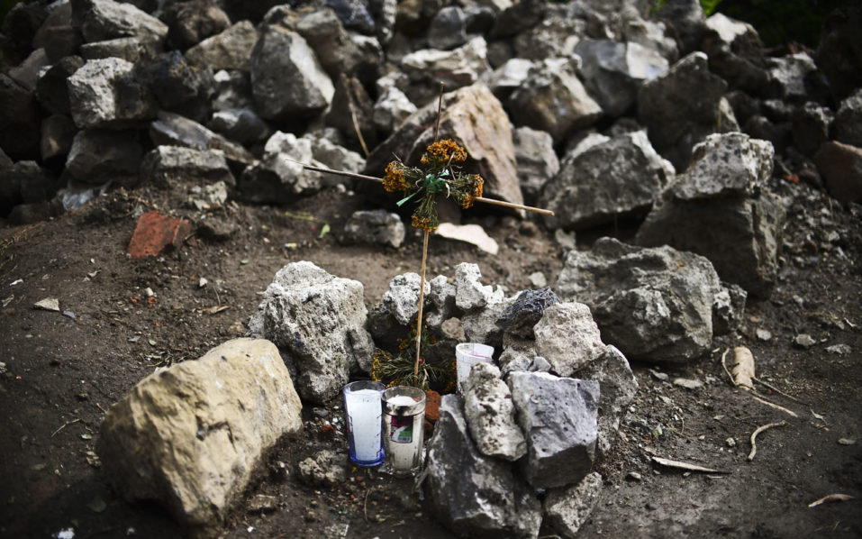 Picture of an altar set next to a wall which collapsed during the quake that rattled the Mexican capital and its surrounding area on September 19, in Xochimilco, Mexico City, on October 4, 2017. The earthquake that hit Mexico on September 19 did not discriminate in its destruction, levelling homes in rich and poor neighbourhoods alike. / AFP PHOTO / Ronaldo SCHEMIDT
