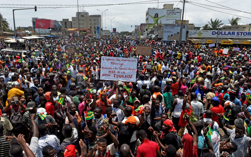 Protesters carry placards while they march shouting slogans as they call for reforms during an anti-government rally in Lome on September 6, 2017. Hundreds of thousands of opposition supporters have protested across Togo calling for constitutional reform, despite an apparent government concession to their demands. Amnesty International country head Aime Adi told AFP “at least 100,000” were in the capital, Lome, with similar demonstrations taking place in some 10 other cities. Opposition party leader Jean-Pierre Fabre for his part called the demonstration “unprecedented” and estimated that “more than one million people” were on the streets of Lome./ AFP PHOTO / PIUS UTOMI EKPEI