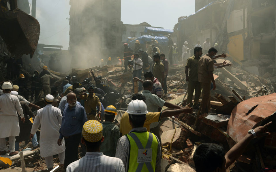 At least three people died and dozens were feared trapped when a building collapsed in India’s financial capital of Mumbai on August 31, after days of heavy rain swamped the city. / AFP PHOTO / Punit PARANJPE