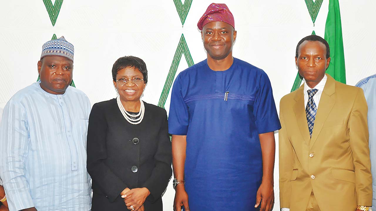 Acting Director, National Agency for Food and Drug Administration and Control (NAFDAC), South-West Zone, Bolakale Ayinde (left); Director-General, Prof. Moji Adeyeye; Oyo State Governor, Seyi Makinde and state Co-ordinator of the agency, Francis Oluwole, during the NAFDAC team’s visit to the governor in Ibadan… yesterday.