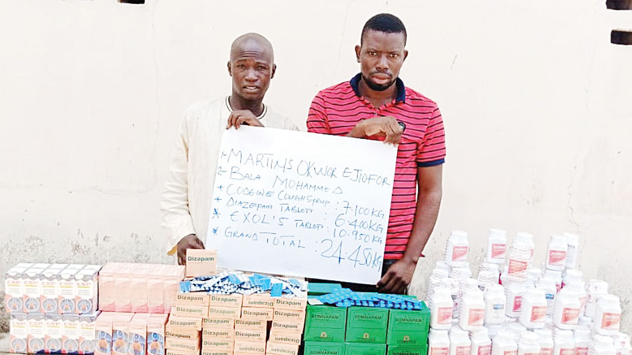 Drugs seized from the suspects, Martins Okwor Ejiofor, 31 and Bala Mohammed, 33, included Codeine (7.100kgs), Diazepam (6.400kgs) and Exol 5 (10.950kg).