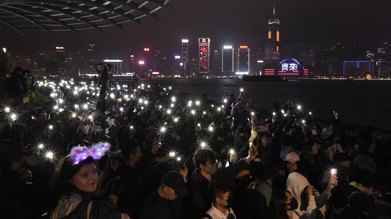 Protesters at the harbourfront counted down chanting “Ten! Nine! Liberate Hong Kong, revolution now!” as they lit up their phones in a sea of lights.