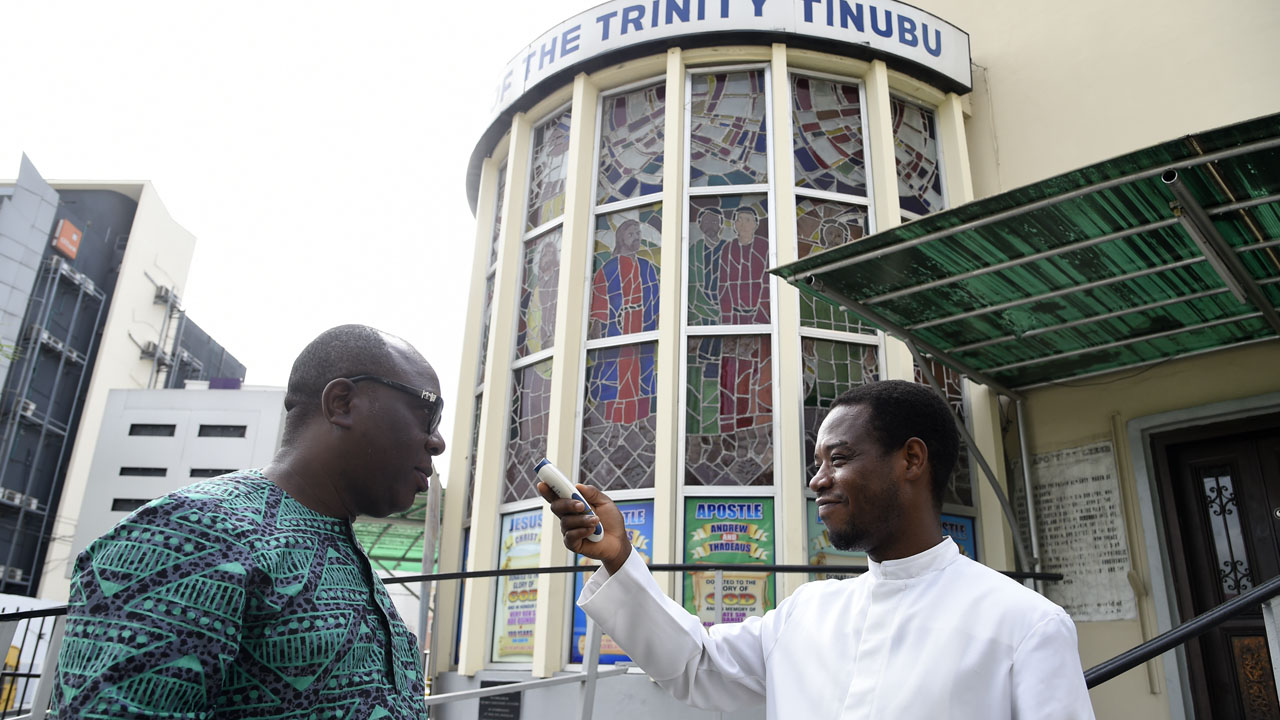 A priest measures the body temperature of Lagos State Commissioner for Home Affairs, Olanrewaju Elegushi (L), on inspection to enforce the government directive against social gatherings at the Methodist Church of Trinity, Tinubu in Lagos, on March 22, 2020. – Nigeria, the most populated country in Africa, on Saturday tightened restrictions in three states on places of worship, airports and bars to try and protect its population against the COVID-19 coronavirus. In Lagos state, Abuja and Ogun, churches, mosques, social gatherings, football viewing centres and night clubs must restrict attendance to 50 people, according to new regulations drawn up by the Presidential Task Force on the COVID-19 coronavirus. (Photo by PIUS UTOMI EKPEI / AFP)Nigeria’s government on Thursday warned that Africa’s most populous nation could soon see an “exponential” increase in coronavirus infections unless contacts of confirmed cases are tracked down quicker.