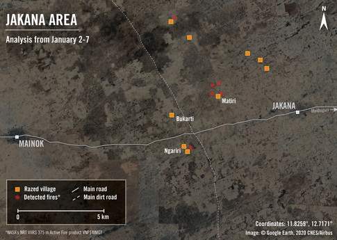 Amnesty International interviewed 12 women and men forced to flee their homes on 3 and 4 January 2020 from three villages near the Maiduguri-Damaturu road, between Jakana and Mainok in Borno State. The organization also reviewed fire data from remote satellite sensing, which indicates several large fires burning on and around 3 January in that area. Satellite imagery of Bukarti, Ngariri, and Matiri shows almost every structure was razed. The imagery also shows signs of burning in neighbouring villages.