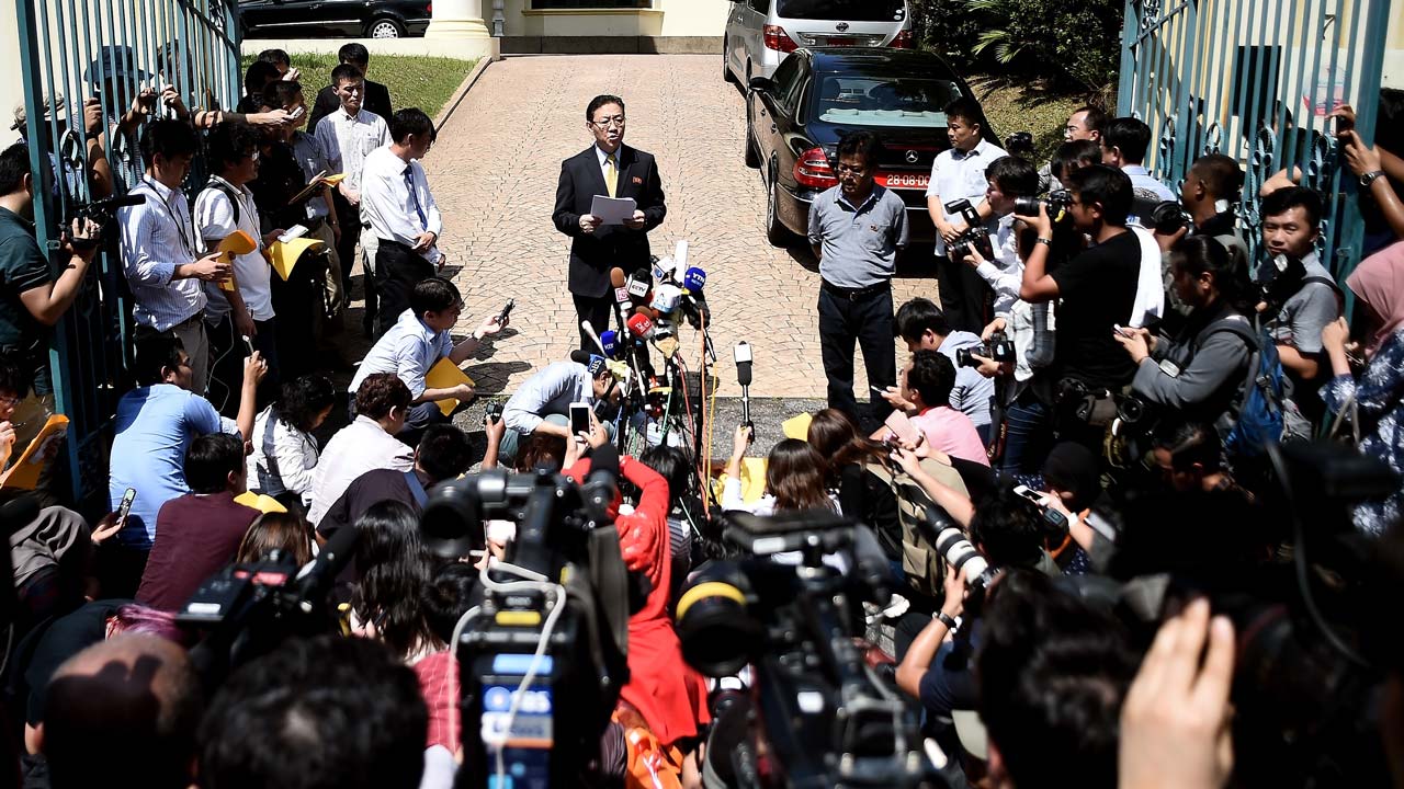 Kang Chol (C), North Korea’s ambassador to Malaysia, addresses journalists outside the North Korean embassy in Kuala Lumpur on February 20, 2017. North Korea cannot trust the Malaysian police investigation into the death of its leader’s half-brother, Pyongyang’s ambassador said after being summoned in the wake of the assassination of Kim Jong-Nam.